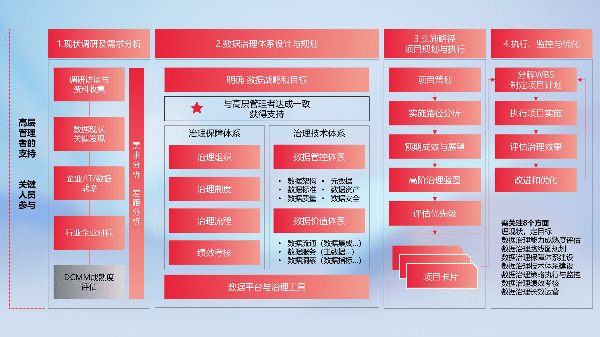 制定并执行统一的数据标准,,,,规范数据定义和格式,,,,消除冗余和不一致性,,,实现跨部门和跨系统的数据一致性,,,为企业提供标准化的数据基础。。
